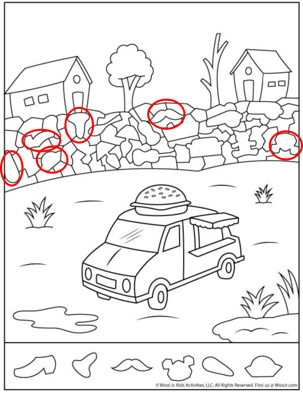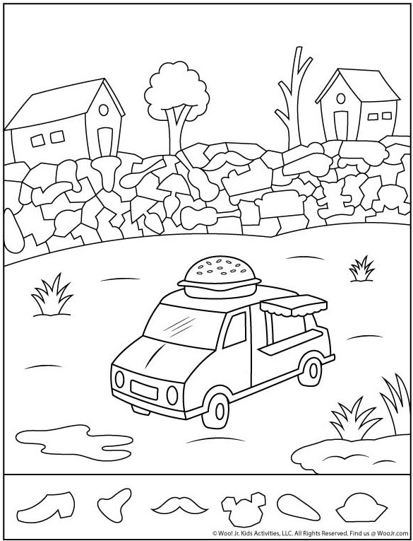 One of the most charming things about this scene is how it blends everyday objects—a food truck, houses, trees—with whimsical touches like the oversized burger rooftop and the playful wall shapes. It feels grounded enough to be real, yet imaginative enough to spark creativity.