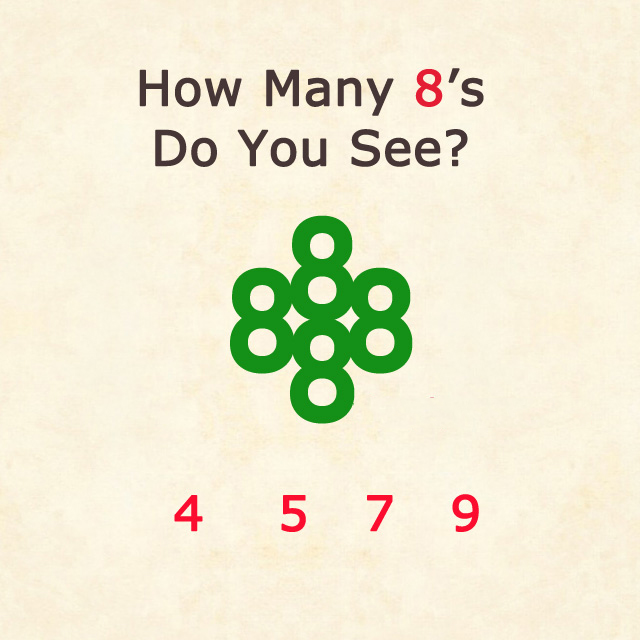 Turn the graphic on its side and you can count four more 8s in the middle section. Because there are no rules stating that you can’t the graphic. You first count there are five 8s now we found four more, so by adding them the total number turns out to be nine.