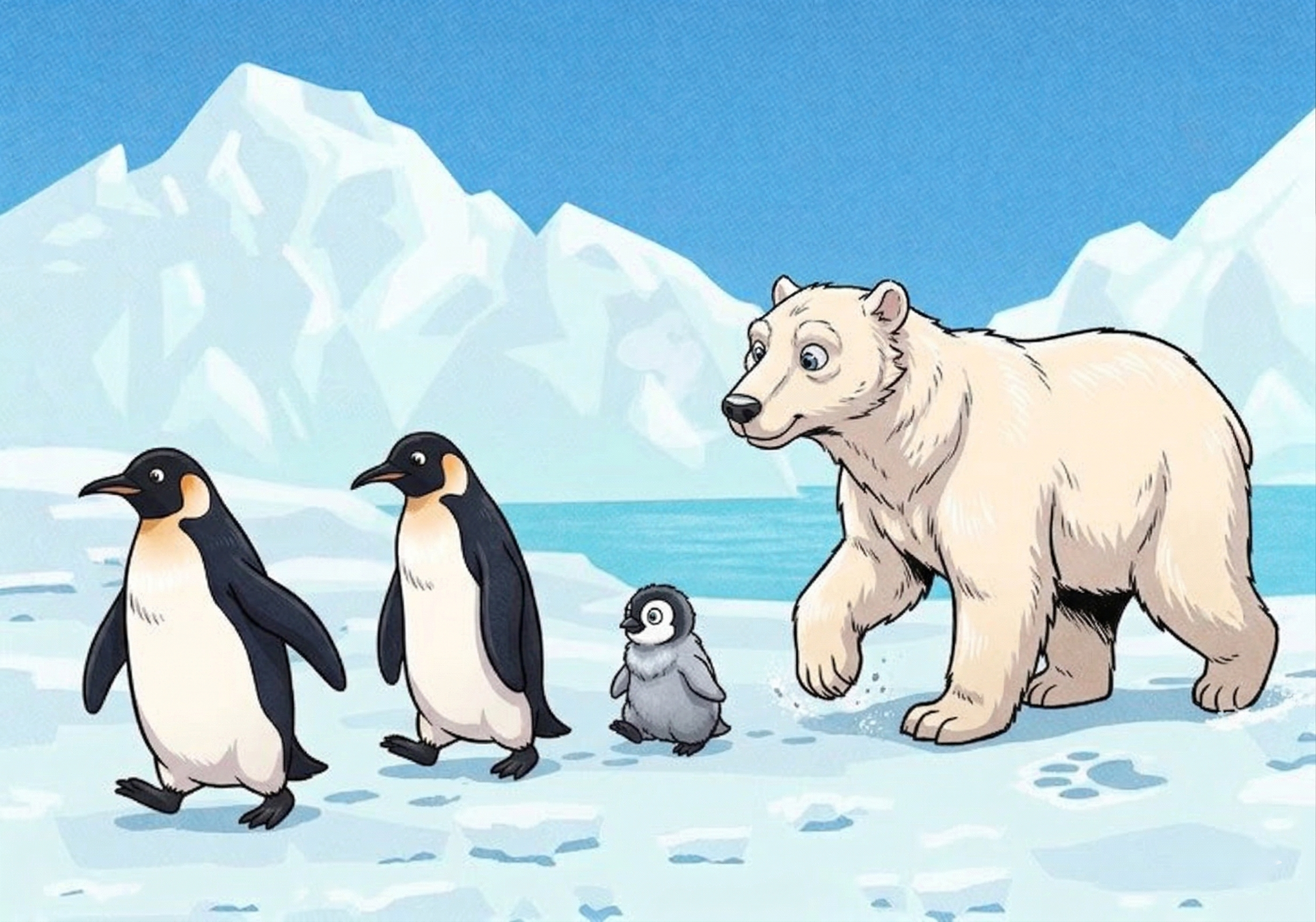 A charming cartoon illustration is shared in the picture above, where a family of King penguins and a polar bear are walking together on a vast sheet of ice.
