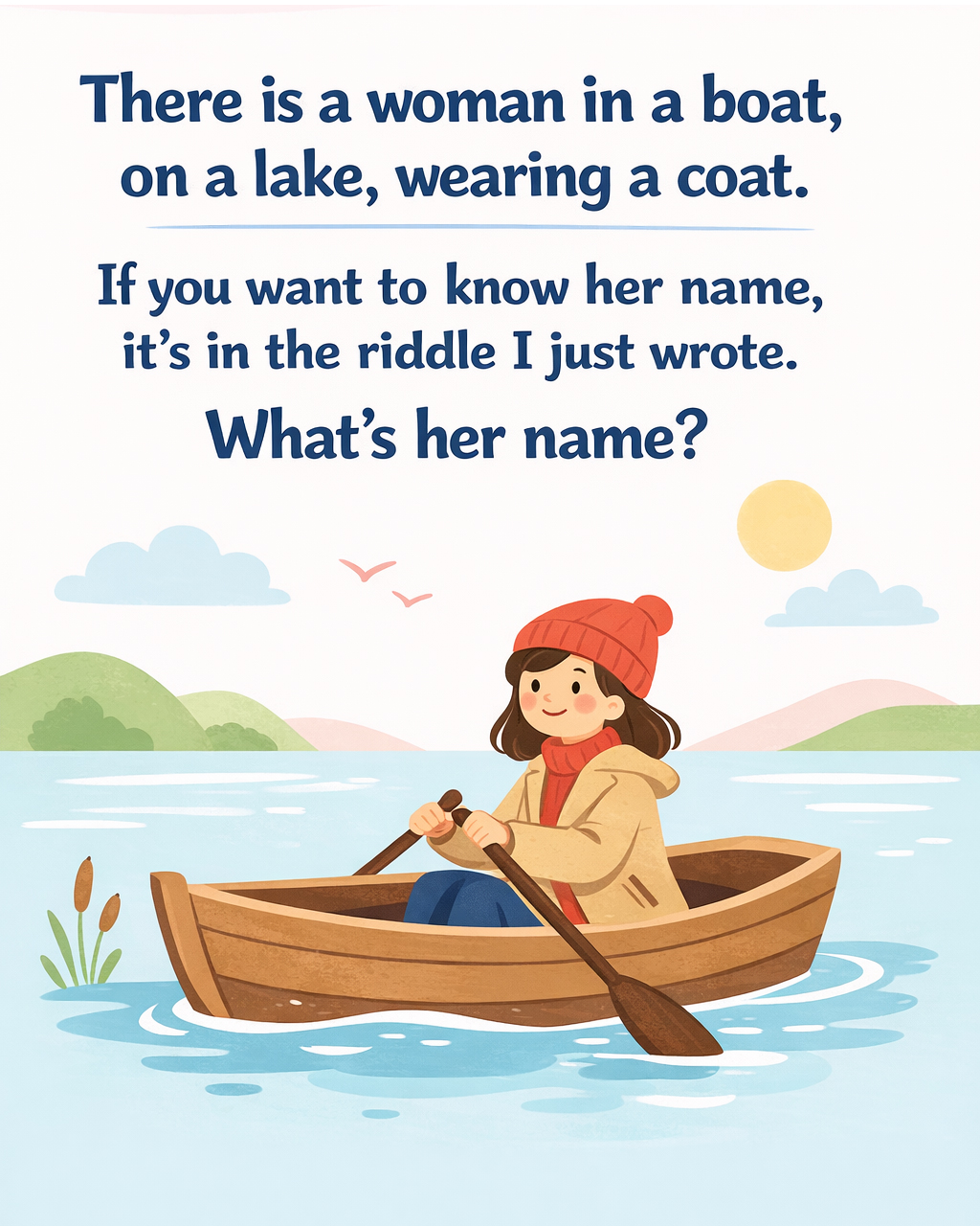 A woman in a boat, on a lake, is wearing a coat. If you want to know her name, it’s in the riddle I wrote. What’s her name?