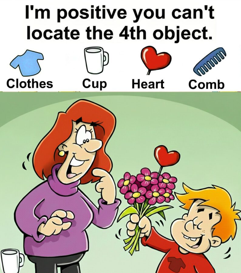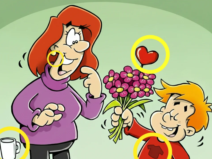 At first glance this image looks sweet and almost nostalgic. A smiling child offers a bouquet of flowers to a happy adult while a red heart floats gently above the moment. It feels warm playful and full of affection. But look again and the scene quietly challenges you. Somewhere inside this cheerful illustration hides a clever visual puzzle designed to test your focus perception and patience.