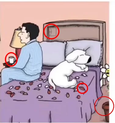 This image works because it feels familiar. A bed. A person. A pet. A cup. Your brain relaxes and fills in the gaps automatically. You think you understand the scene within seconds, and that confidence becomes the trap.