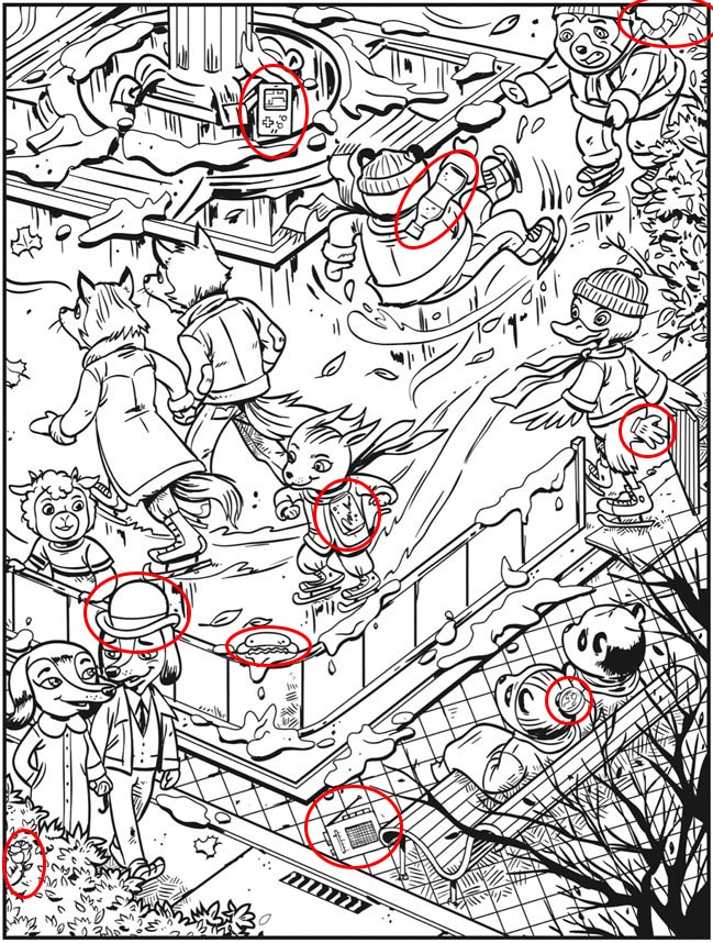 This image is more than storytelling. It is an interactive challenge. Hidden objects are cleverly tucked into the environment, blending into fences, snow piles, clothing folds, and background details.