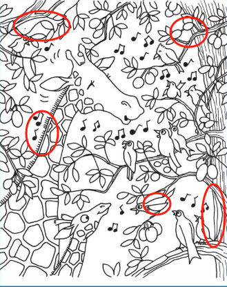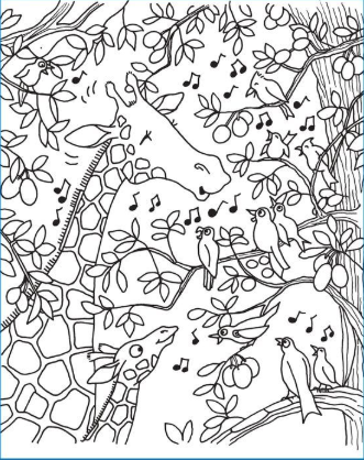 Surrounding the giraffe are dozens of birds, each poised to contribute its unique sound: