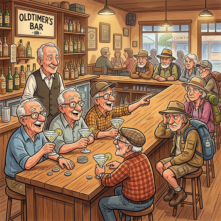 The bartender says, “Oh, they’re all grey nomads from the caravan park, waiting for happy hour when drinks are half price.’