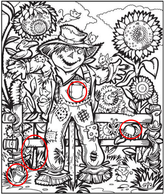 - Scan in sections: Break the picture into parts—the scarecrow, the flowers, the fence, the ground. Searching one area at a time makes it easier to focus.