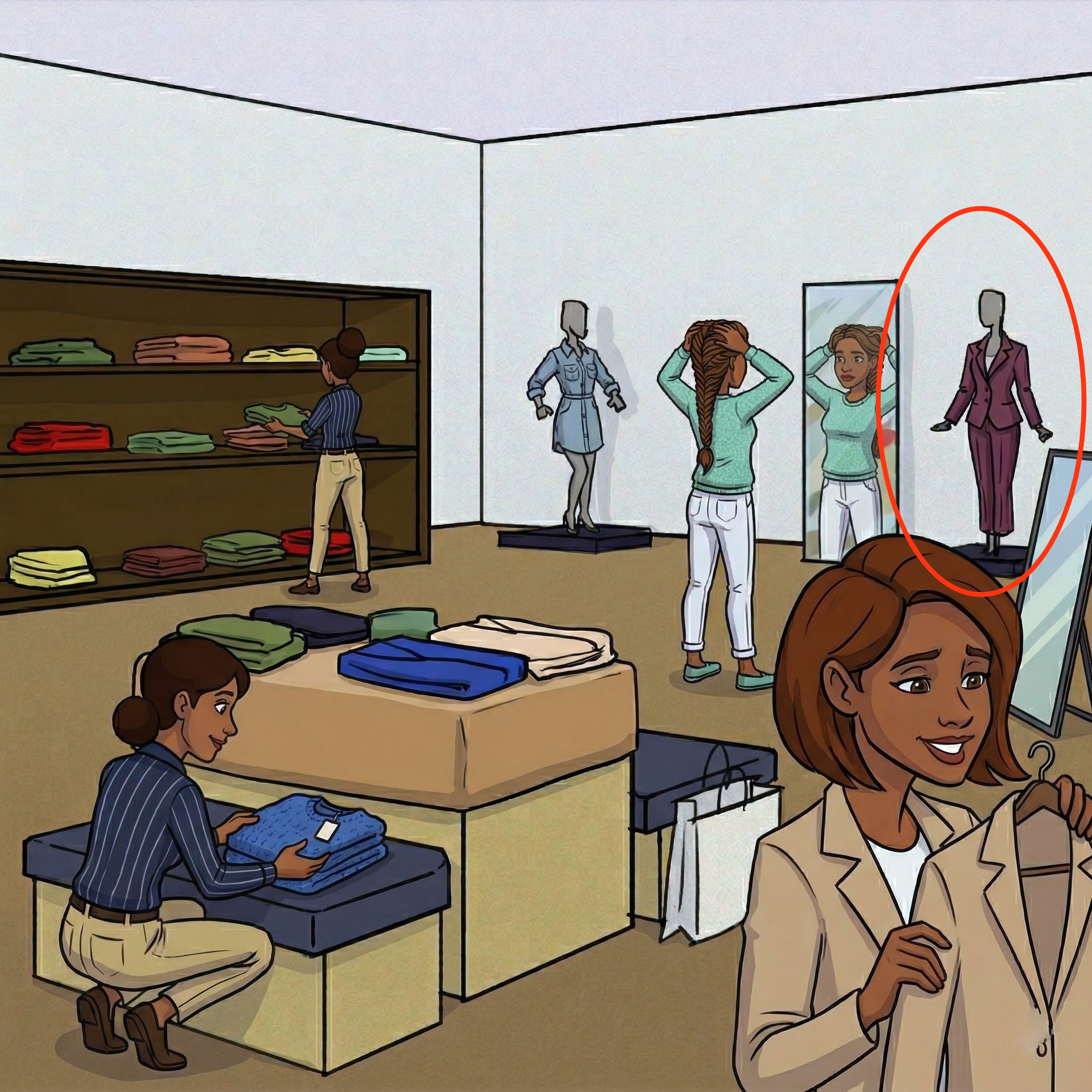 Let’s check this busy clothing store scene, shared in the picture above.