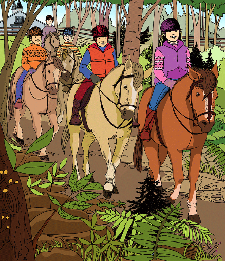 There’s something magical about wandering through the woods on horseback—especially when you’re surrounded by friends, crisp air, and the gentle rhythm of nature. This vibrant illustration shows a cheerful group of kids riding their horses along a peaceful forest trail. The scene is bursting with warmth, sunshine, and the irresistible charm of the great outdoors.