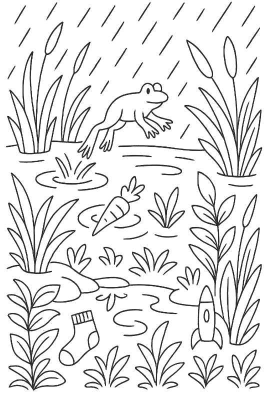 Let’s dive right into the picture. A cheerful frog springs over a rippling pool, raindrops sketch diagonal lines across the sky, and cattails frame the water’s edge. At first glance, everything seems delightfully ordinary—until you notice the oddball carrot bobbing next to the lily pad, a lone sock peeking from the reeds, and even a miniature rocket standing guard on the bank. These whimsical additions invite you to slow down, look closely, and uncover every hidden detail.