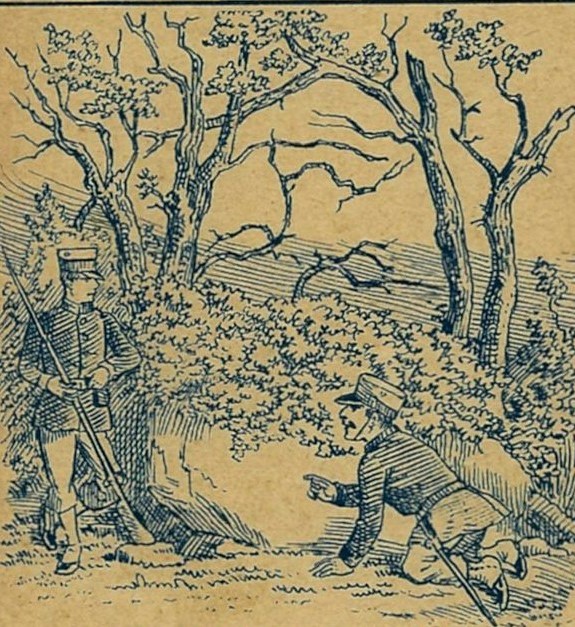 Imagine you’re stepping quietly through dense underbrush, heart pounding as every twig snap echoes like a gunshot. That’s the world captured in this century-old sketch: a vigilant soldier standing guard while his comrade presses close to the ground, peering into a shadowy hollow. It’s not just a drawing—it’s a window into the art of military reconnaissance, where every leaf could conceal danger, and every moment holds the promise of discovery.