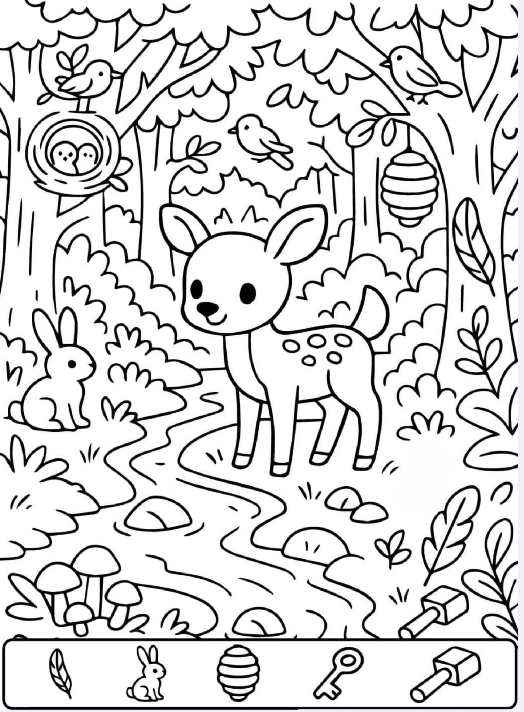 This woodland hidden object illustration is more than a cute coloring page. It’s a visual puzzle, a creativity booster, and a calm mental workout wrapped into one gentle scene.
