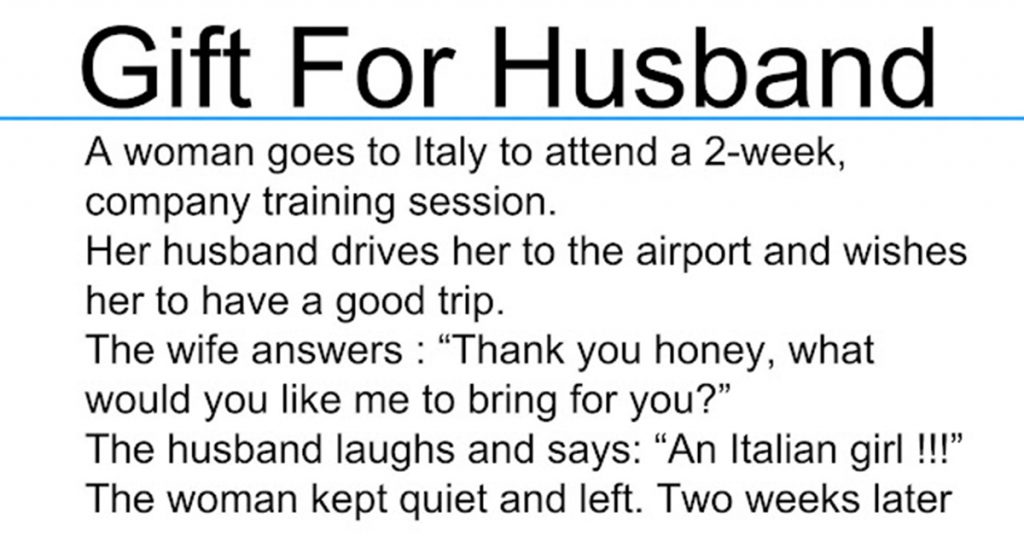 Two weeks later, he picks her up at the airport and asks, “So, honey, how was the trip?”