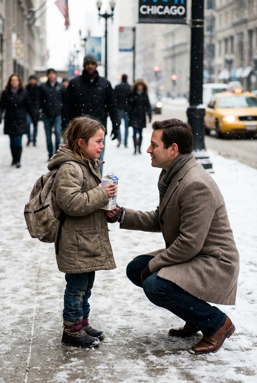 “Please, sir,” said a girl no older than ten, her cheeks raw from the cold, her oversized coat hanging limply around her small frame. “My baby brother’s hungry… just one box of milk. I promise I’ll repay you when I grow up.”