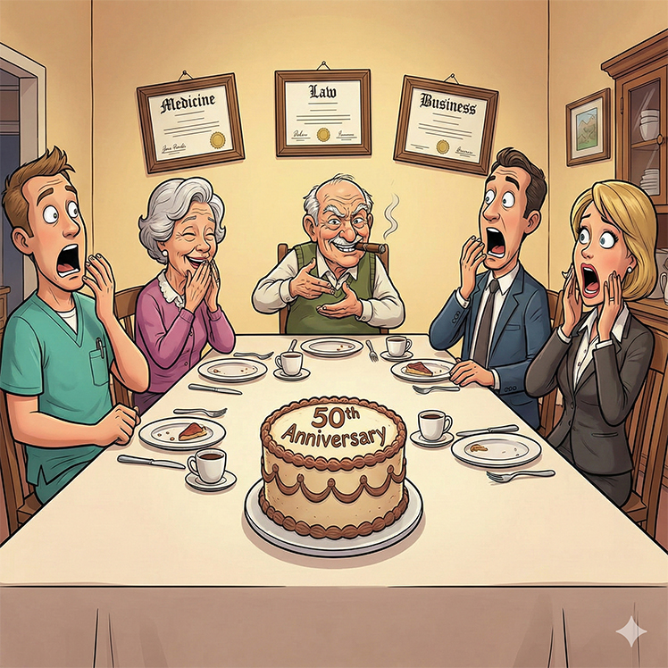 “Happy Anniversary, Mom and Dad!” exclaimed the eldest son, a surgeon. “Sorry, I’m late. I had an emergency at the hospital and couldn’t get a gift.”