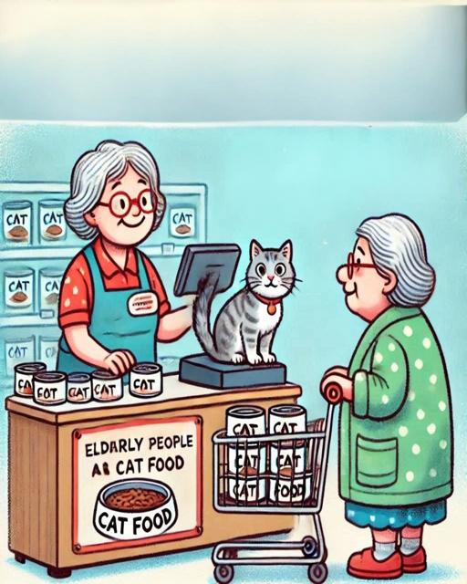 The cashier looked at her and said, “I’m sorry, but we can’t sell you cat food without proof that you actually have a cat. Management says some elderly people buy it to eat, so we need to make sure it’s for your pet.”