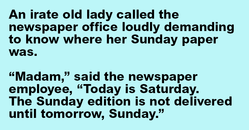“Madam,” said the newspaper employee, “Today is Saturday. The Sunday edition is not delivered until tomorrow, Sunday.”