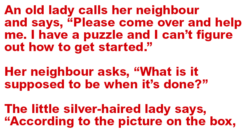 An old lady calls her neighbor and says, “Please come over and help me. I have a puzzle and I can’t figure out how to get started.”