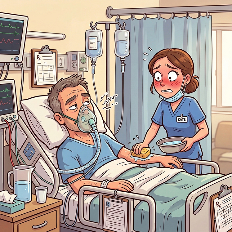 The nurse froze—flustered. “Sir, I’m only assigned to clean your upper body and feet,” she said softly.