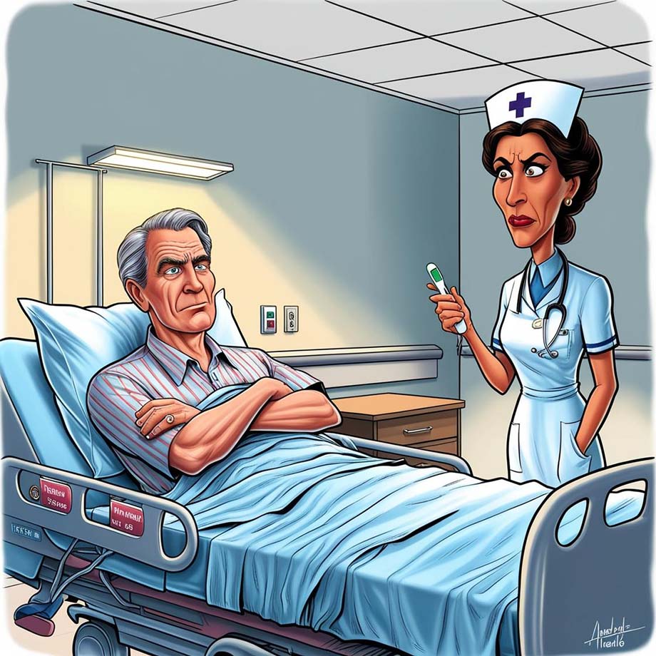 Once the thermometer was inserted, the nurse smirked. “I need to get something. You stay JUST LIKE THAT until I get back!”