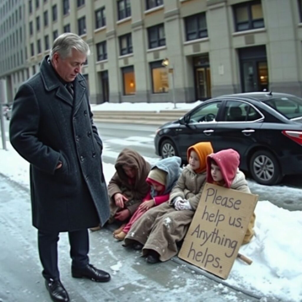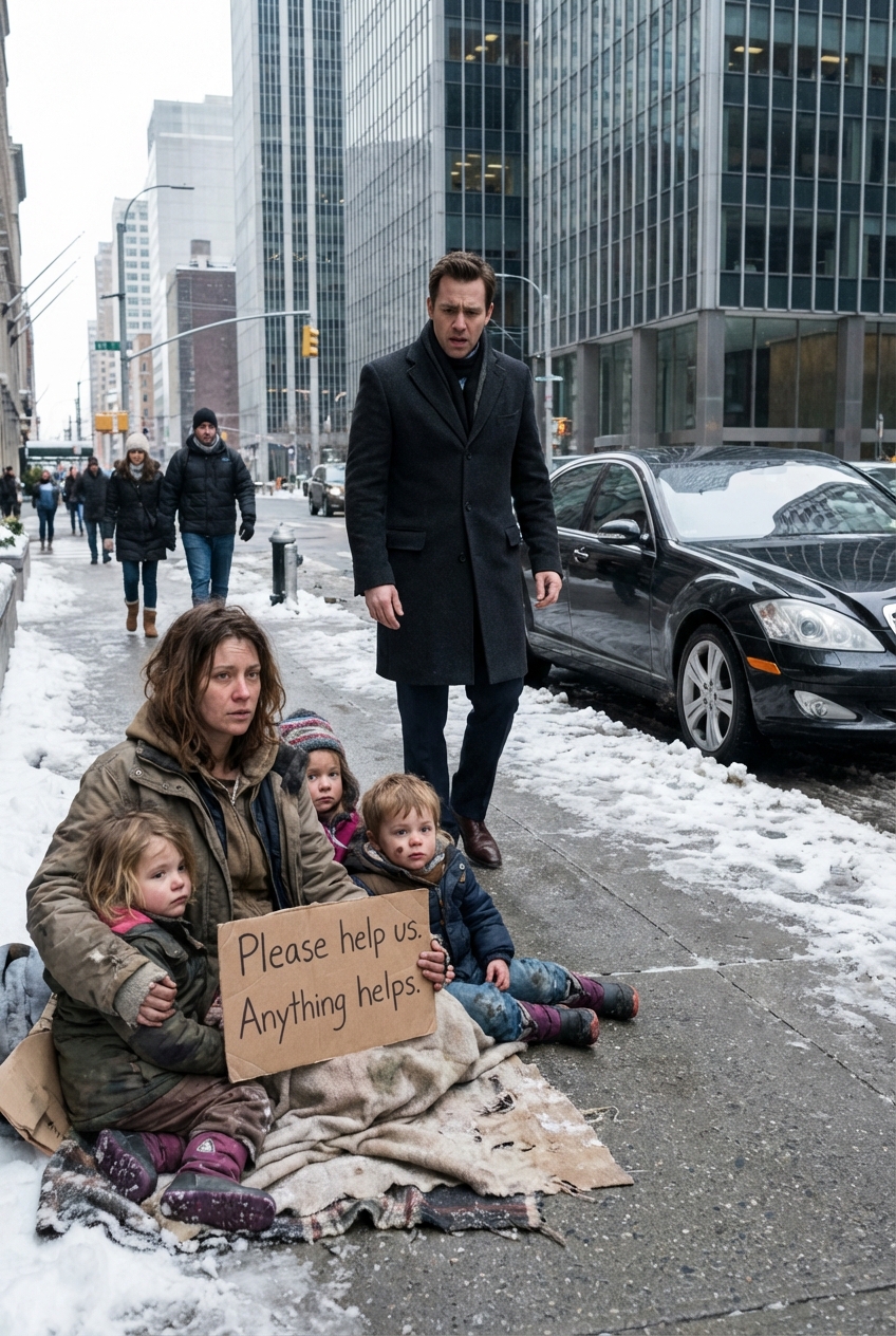 Sitting against an old brick wall, wrapped in a battered coat that barely counted as clothing, with hair tangled by cold wind and hopeless days, was a woman he never thought life would throw back at him again. And not just alone. Three children huddled tightly beside her, small bodies pressed together for warmth, cheeks flushed from freezing air, eyes too wise for children their age. She held a cardboard sign written in shaky letters: