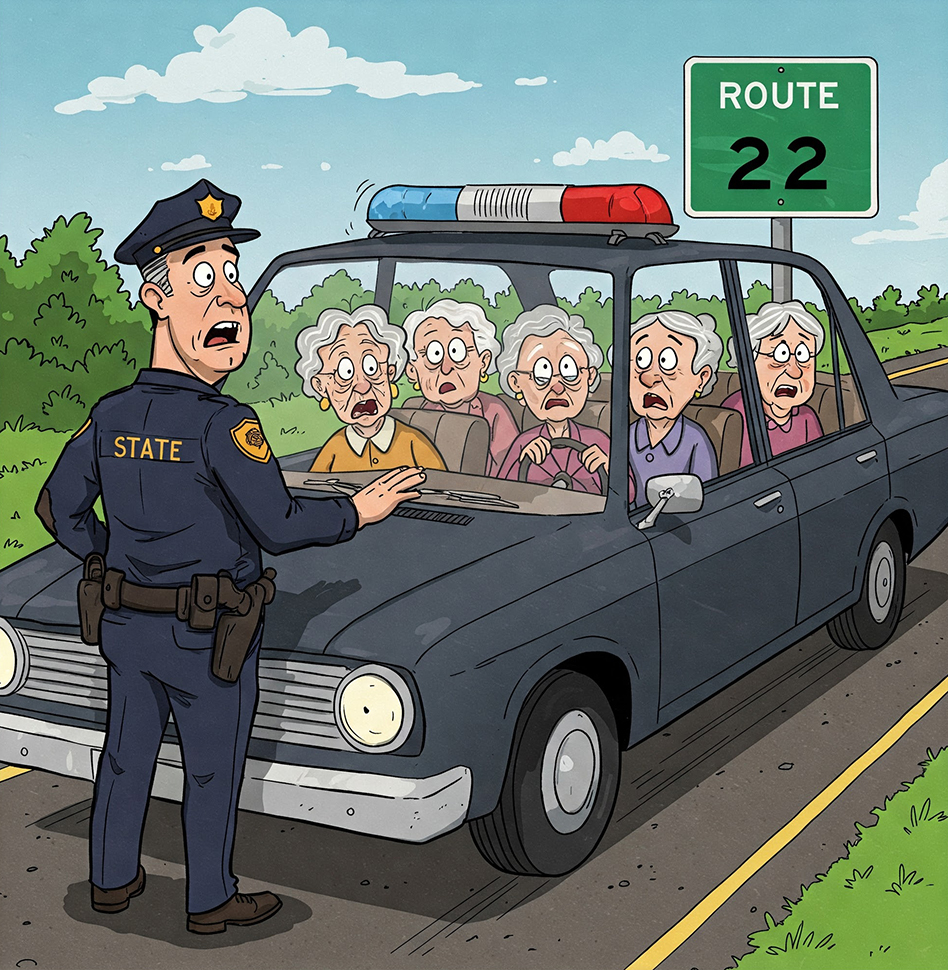 The State Police officer, trying to contain a chuckle, explains to her that “22” was the route number, not the speed limit.