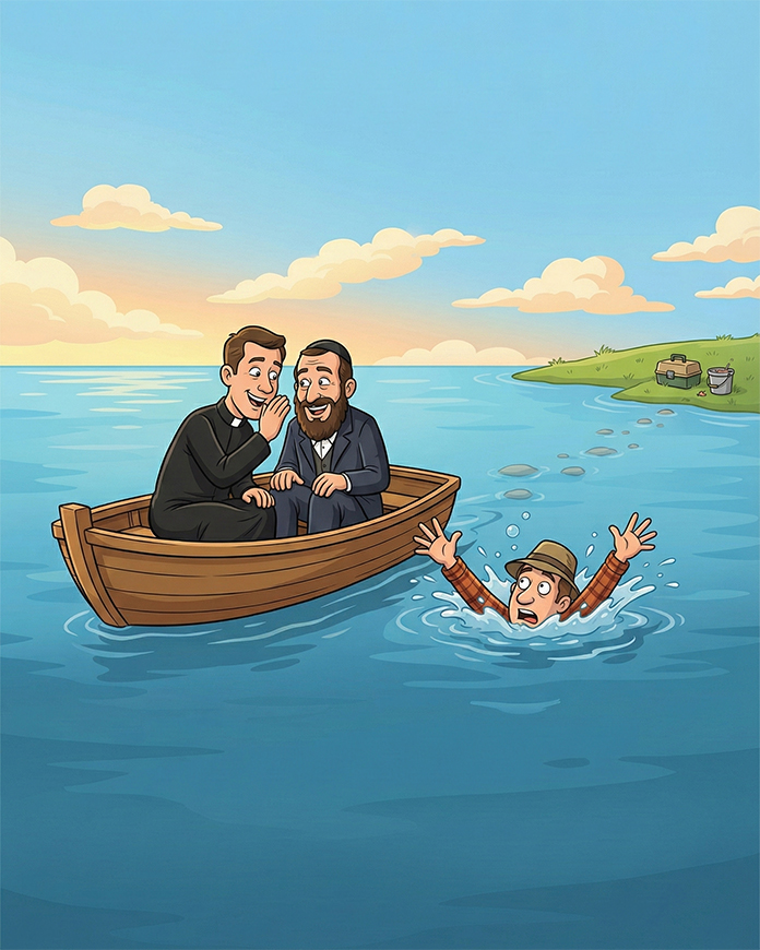 As bubbles rose to the surface, the priest leaned toward the rabbi and whispered, grinning, “Think we should’ve told him about the rock path?”