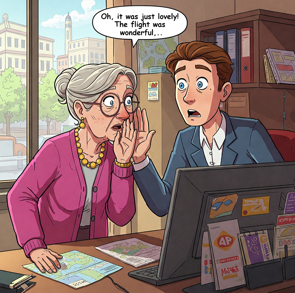 “Oh, it was just lovely! The flight was wonderful, and the hotel was like something out of a dream,” she said. “I came to say thank you… but I do have one question.”