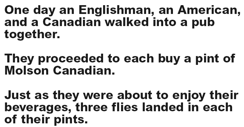 One day an Englishman, an American, and a Canadian walked into a pub together.