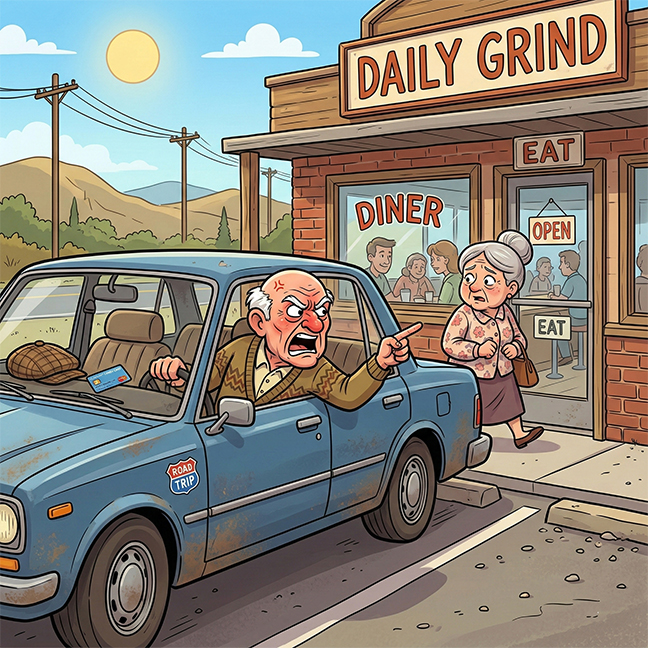 Just as she was about to enter, the old man rolled down his window and called out, “While you’re in there, you might as well grab my hat and the credit card!”