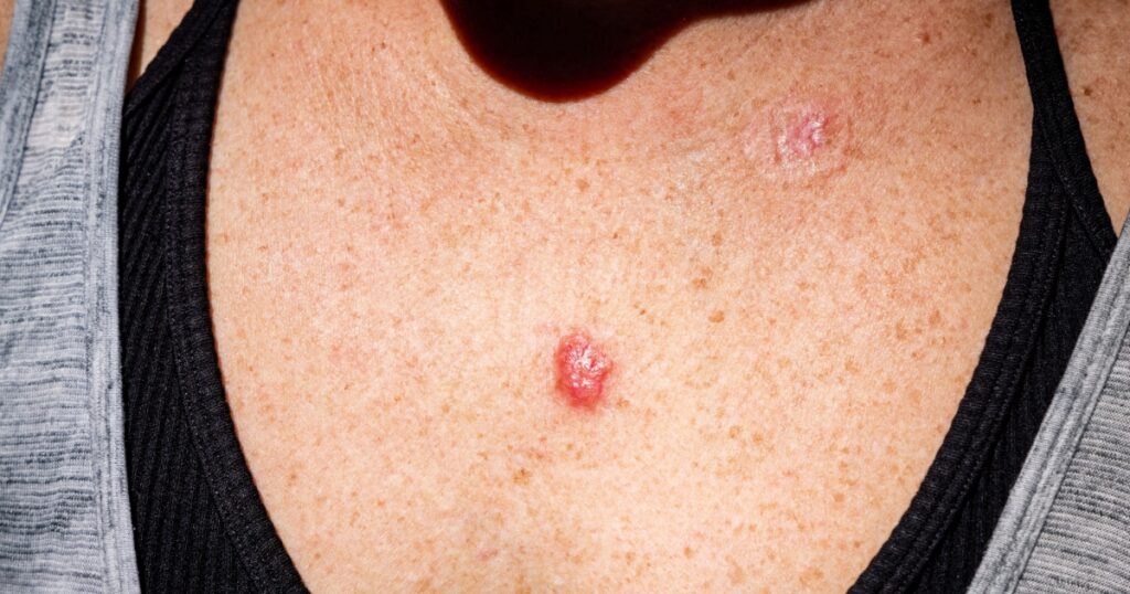 Different types of skin cancer (melanoma, basal cell carcinoma, and squamous cell carcinoma) can cause these, so be aware of any odd-looking growths or spots.