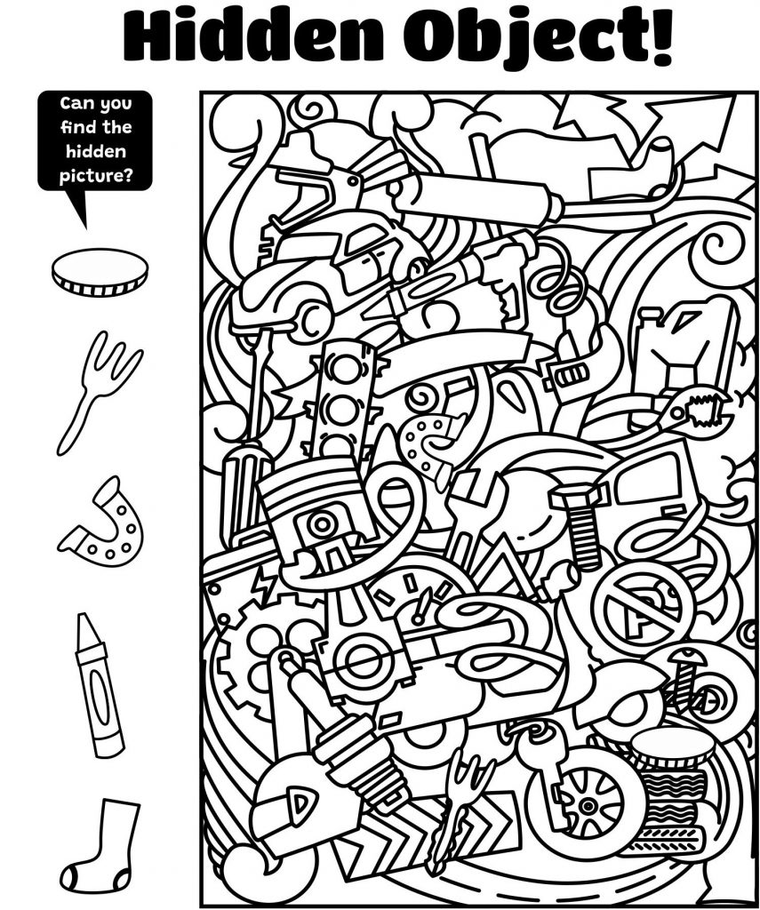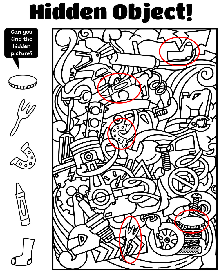 - Look for contrast.Even in black-and-white drawings, small differences in thickness or shape can reveal hidden items.