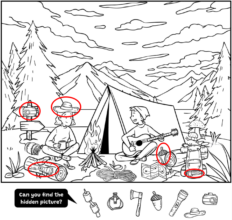 Looking closely at the illustration, we can see that the campers came well-prepared. Their gear highlights the basics every camper should bring for a safe and enjoyable experience: