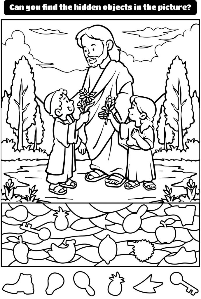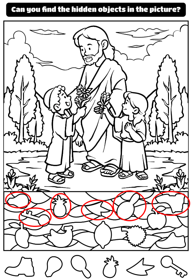 In a peaceful meadow surrounded by tall trees and gentle skies, a touching scene unfolds. A kind figure stands at the center, radiating warmth and compassion, while two children joyfully offer him flowers. The moment feels simple, yet deeply meaningful — a reflection of love, gratitude, and connection. But this image holds more than meets the eye. Hidden within its gentle lines are secret shapes waiting to be discovered. This is not just a beautiful picture — it’s a hidden object puzzle that invites you to look closer, think deeper, and find joy in every detail.