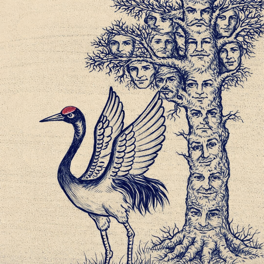 At first glance this artwork feels quiet and dreamlike. A graceful crane with wings lifted mid motion stands beside a tree unlike any you have seen before. Its branches do not hold leaves alone. They hold faces. Human faces woven into bark and branch as if memory itself decided to grow roots. This image does not shout. It whispers. And that whisper stays with you long after you stop looking.