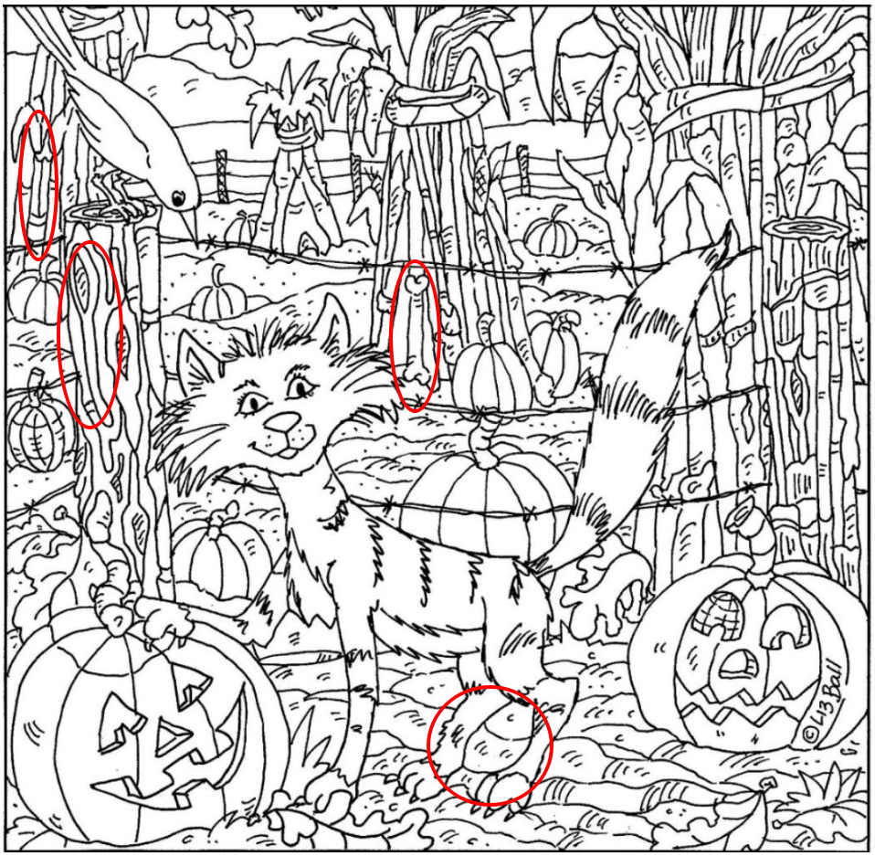 Maybe there’s a hidden mouse peeking from behind a pumpkin, or a spider weaving its web near the fence. Perhaps a broom, a leaf, or even a tiny bat blends into the harvest scene. Some shapes are so well-camouflaged they appear to be part of the cornstalks or vines.