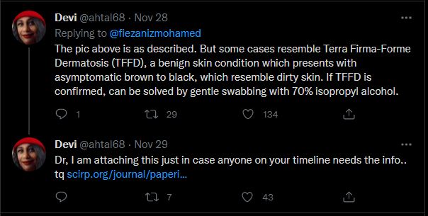 Another concerned netizen added that the picture Dr. Hafizah shared also could be caused by a different condition called ‘Terra Firma-Forme Dermatosis’ (TFFD).
