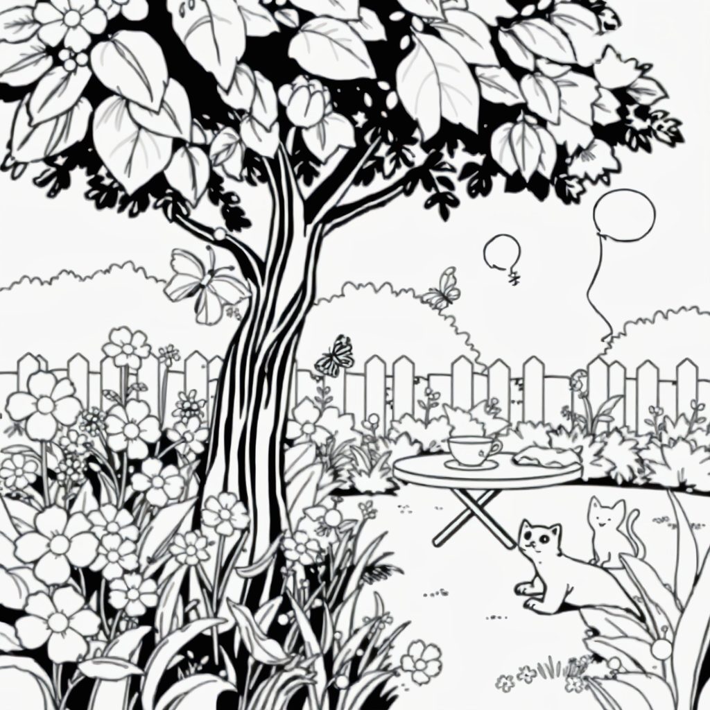 There’s something magical about spending time in a peaceful garden, surrounded by vibrant flowers, playful animals, and the calming presence of nature. The image of a serene garden scene, featuring a tree, blooming flowers, and curious cats lounging by a cozy table, invites us into a world of tranquility and joy. In a world that often moves at a fast pace, moments like these remind us of the simple pleasures of life—connecting with nature, relaxing outdoors, and enjoying the company of animals.