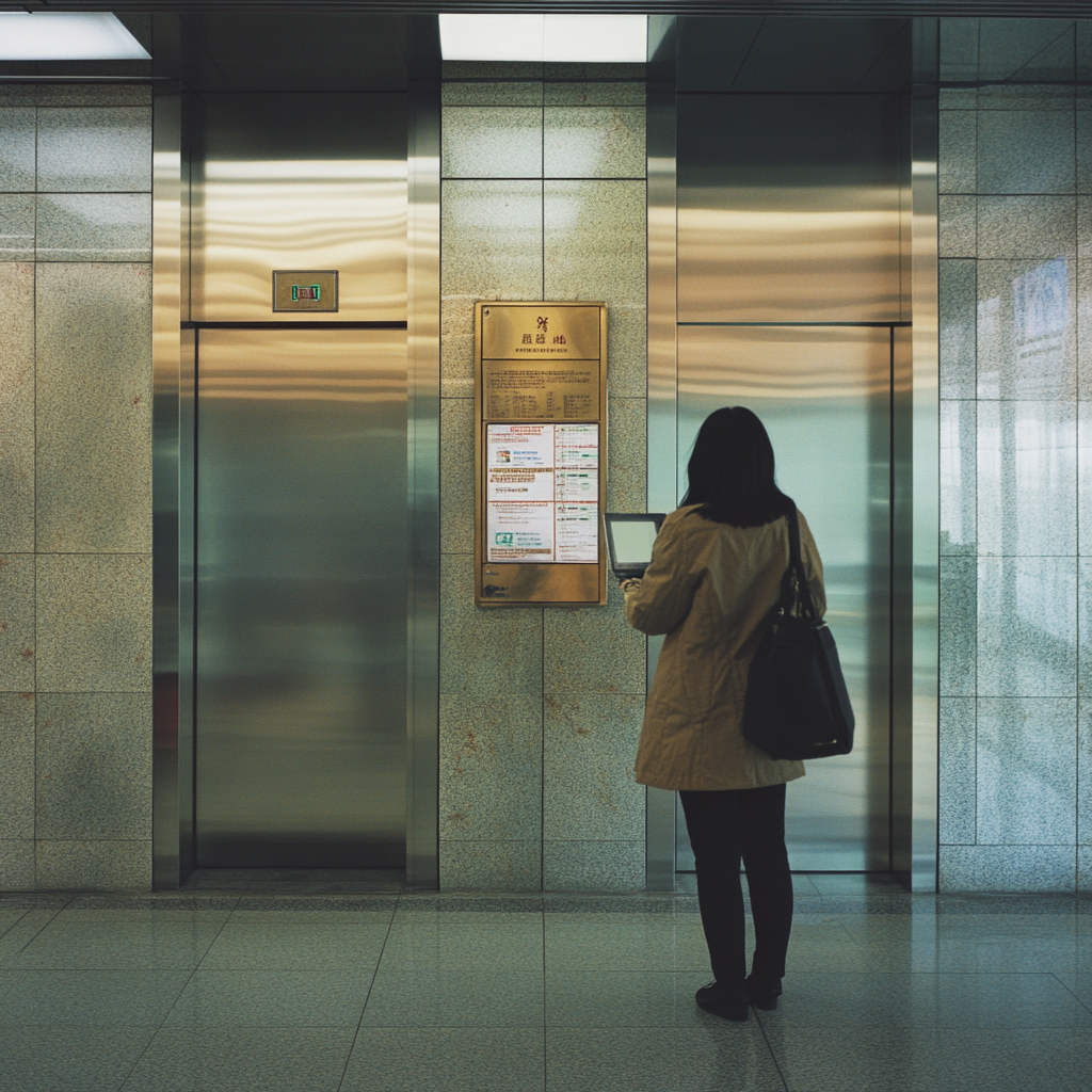 A woman studying a sign near an elevator | Source: Midjourney