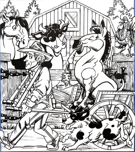 What’s going on here? The dog running in front of the farmer has the black-and-white spots of a cow. Is it trying to blend in? Or is it part cow?