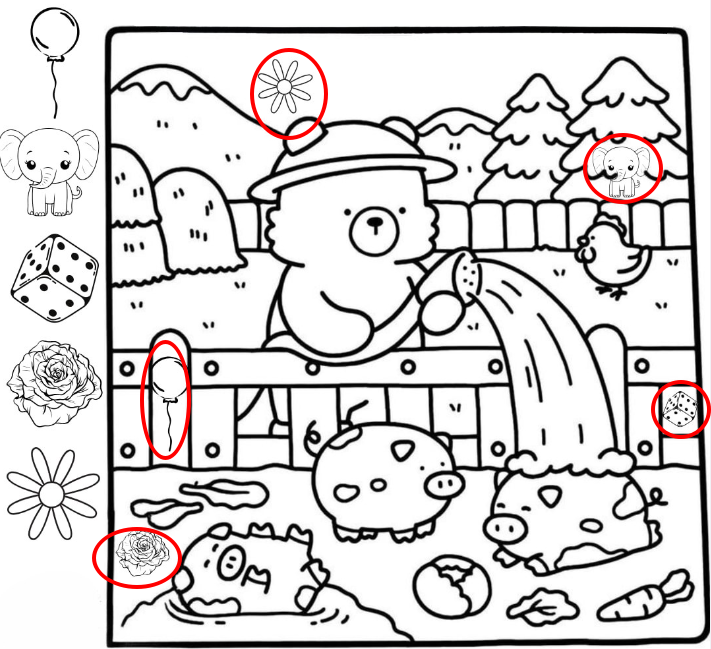 There’s something irresistibly charming about a playful farmyard scene—especially when it doubles as a hidden object challenge. In this whimsical illustration, we find ourselves in the middle of a cheerful countryside setting, where a bear in a hat waters a group of happy pigs. At first glance, it’s all smiles and simple farm life. But the longer you look, the more surprises pop out from the background. This is a puzzle that rewards patience, attention, and a love for the little details.