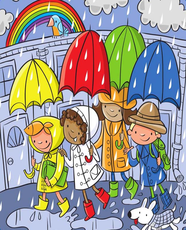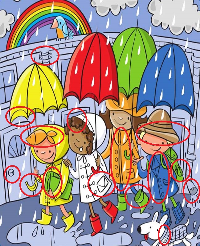 Though the main characters are the children and their umbrellas, don’t forget the sky above them. Is the rainbow just a backdrop, or are there subtle surprises nestled within the clouds? Perhaps the rainbow holds more than just color—could there be a hidden object tucked away within the clouds or rainbow itself?