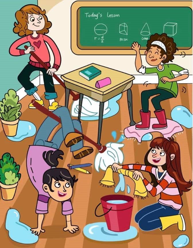 This cartoon may look like simple classroom chaos, but it’s a powerful brain teaser in disguise. Each mop, puddle, and misplaced student is a challenge to the viewer to slow down, think critically, and find the funny.