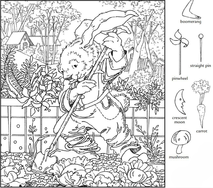 At first glance, this illustration looks like a simple pastoral story. A rabbit dressed in overalls works diligently in a garden, hoe in hand, surrounded by rows of vegetables, leafy greens, and tall trees. But this isn’t just a cute picture—it’s a hidden object puzzle cleverly packed with surprises. Look closely, and you’ll notice that what appears to be an ordinary gardening scene is filled with disguised shapes, subtle details, and hidden figures that bring the image to life in unexpected ways.