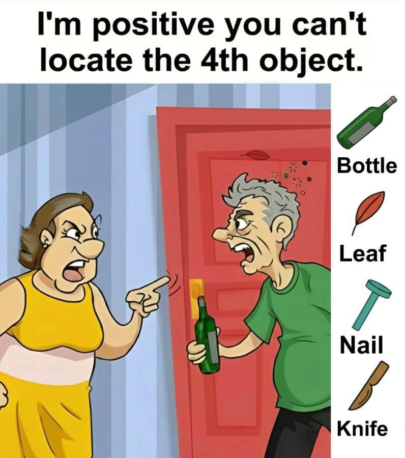 This hidden object puzzle uses human conflict as its strongest weapon. By filling the scene with emotion it quietly steals attention from the details that matter. The arguing couple the bold door and the familiar objects all work together to mislead the eye and rush the mind. Solving it requires more than sharp vision. It demands emotional control patience and methodical focus. In the end the puzzle is not just about finding the fourth object. It is about learning how easily attention slips away and how powerful it feels when you take it back.