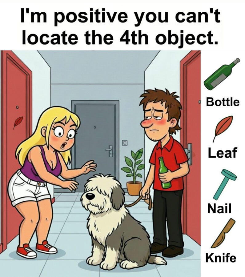 Find Bottle, Leaf, Nail, Knife.