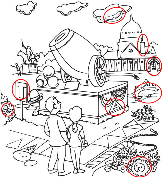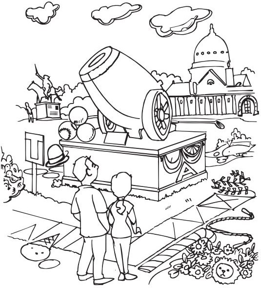 You’re standing at a historical monument, admiring a massive cannon with an ornate base, some cannonballs nearby, and a pair of tourists taking it all in. Looks normal, right? Now look again. Is that a slice of pizza on the sidewalk? A lion’s face in the bushes? Is one of those cannonballs actually a baseball?