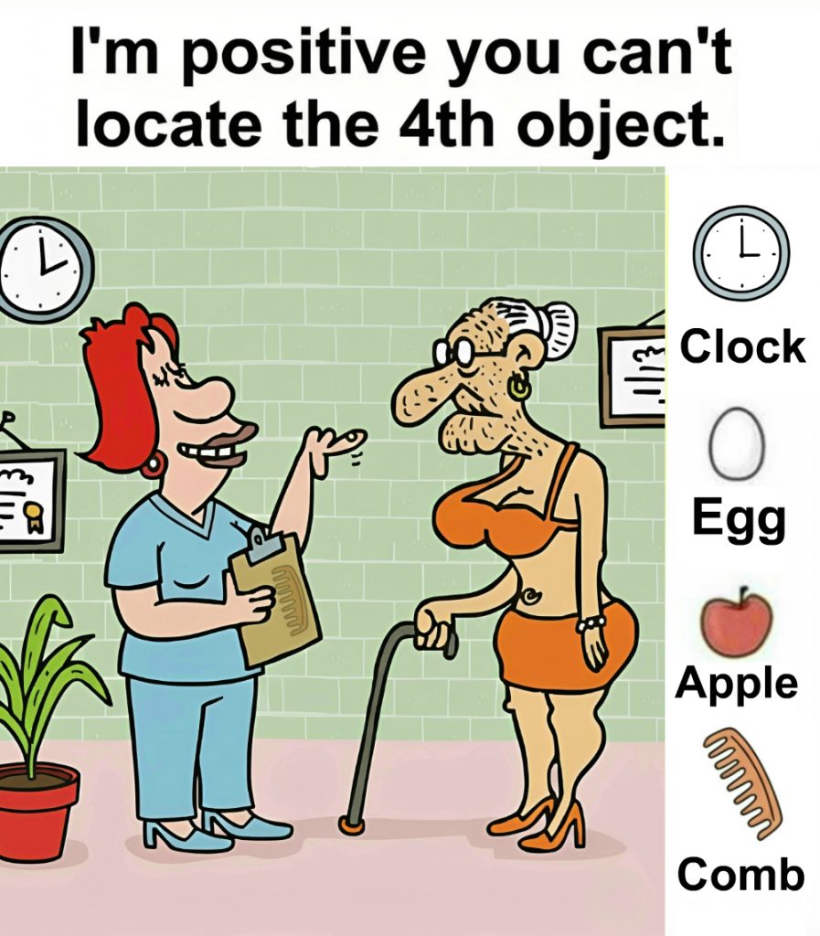 The items in this puzzle are not exotic. A clock. An egg. An apple. A comb.