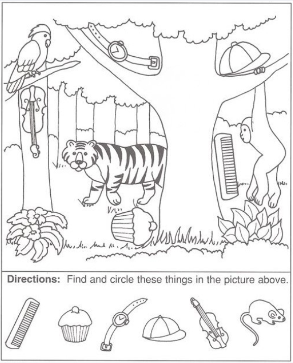 Step into a playful jungle where curiosity rules, animals peek from behind trees, and everyday objects hide in the most unexpected places. At first glance, this black-and-white illustration looks like a simple jungle scene — a tiger strolling through the forest, a monkey climbing a tree, and a parrot perched above. But look again. This picture is more than just cute artwork. It’s a full-blown hidden object challenge designed to test your focus, spark your imagination, and keep your eyes glued to every tiny detail.