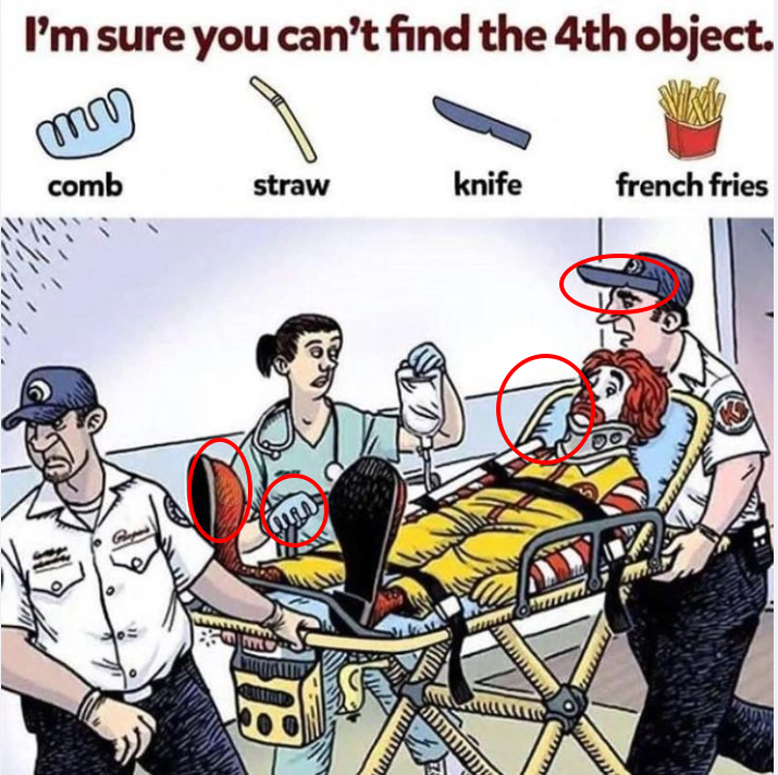 The image in question depicts an unusual rescue mission. We see a well-known clown, resembling the mascot of a popular fast food chain, being wheeled into an emergency room by paramedics. While the image itself might appear somewhat chaotic, the humor lies in the details that make this puzzle interesting. Not only is the clown in a somewhat ridiculous situation, but there’s a twist to the puzzle – you’re tasked with finding the fourth hidden item amidst the scene.