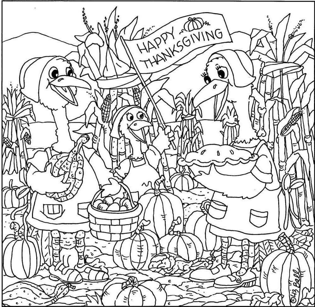The “Happy Thanksgiving” banner adds a personal touch, making this scene feel like a snapshot from a turkey family album. Even though it’s black-and-white, the scene is bursting with visual warmth and seasonal spirit.